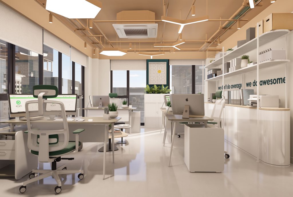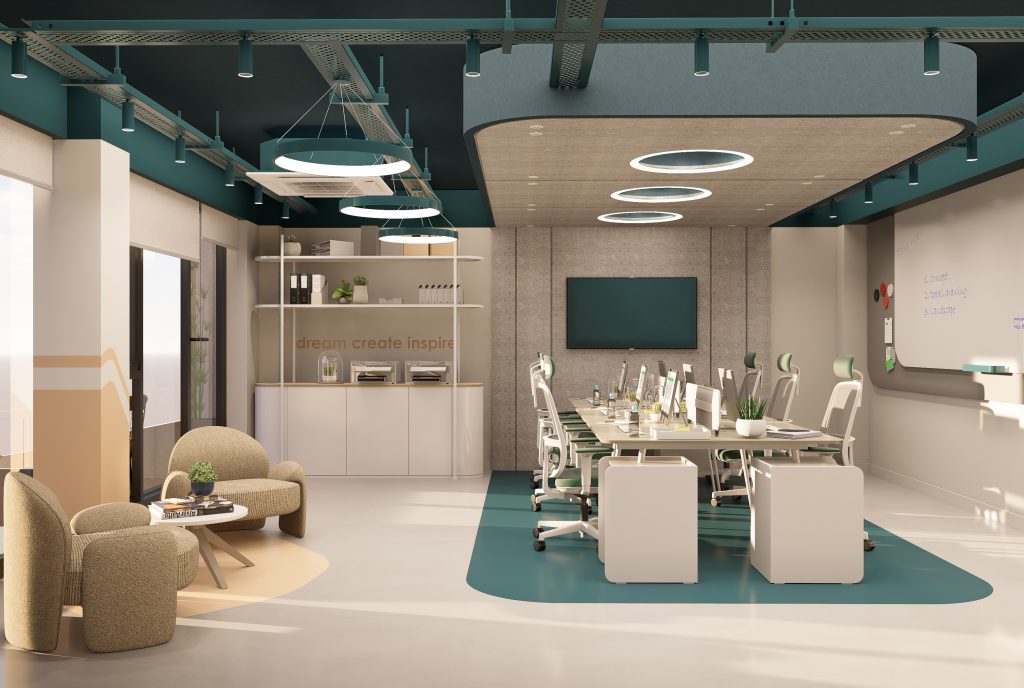 An industrial ceiling language, integrated linear lighting, and a modular furniture system reinforce a contemporary, flexible, and sustainable working environment, tailored to evolving modes of work.